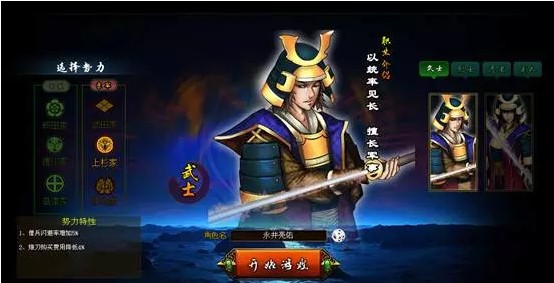 第六天魔王-织田信长,日本第一兵-真田幸村,天下御免的倾奇者-前田庆次,等等。每个武将不同的属性,不同的个人战技能、合战技能。让你左站明智光秀,右边武田信玄,命令着伊达政宗,攻占九州,本川,四国等各城,统一日本!